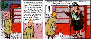 tintin attend pour rien à une cabine téléphonique un personnage qui se protège de la pluie