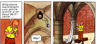 tintin lance une ficelle dans un anneau au plafond pour faire un bélier