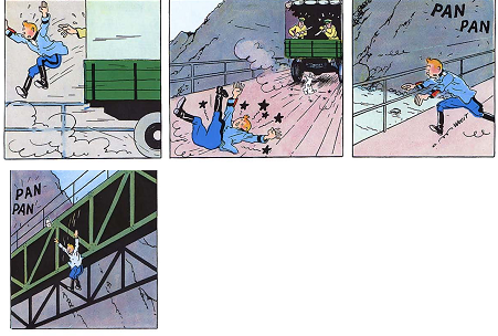 tintin s'échappe en sautant du camion puis du pont
