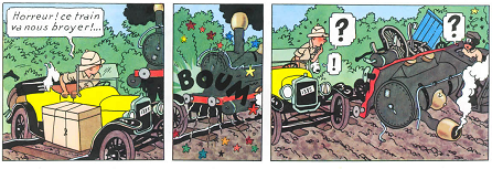 la voiture de tintin reste intacte quand un vieux train africain la percute et se detruit