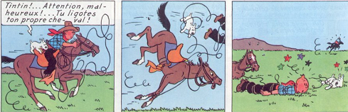 tintin s'emmêle les pinceaux avec son lasso sur son cheval et tombe